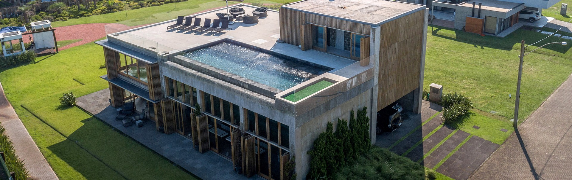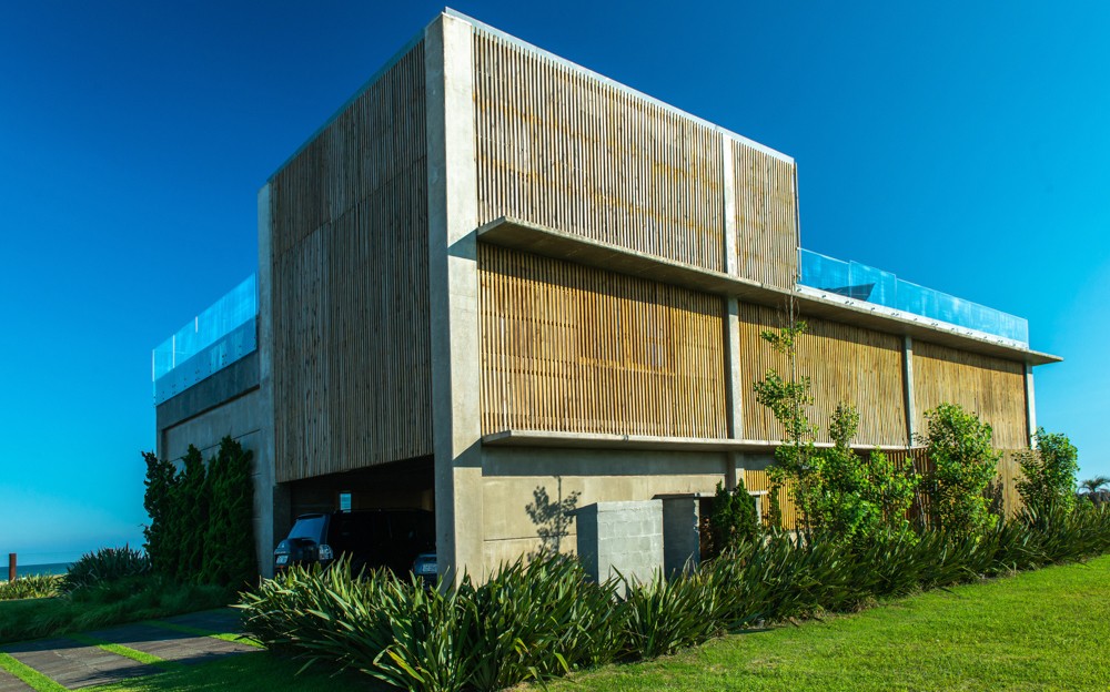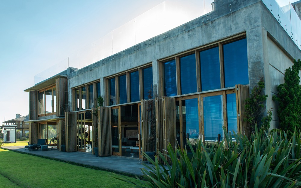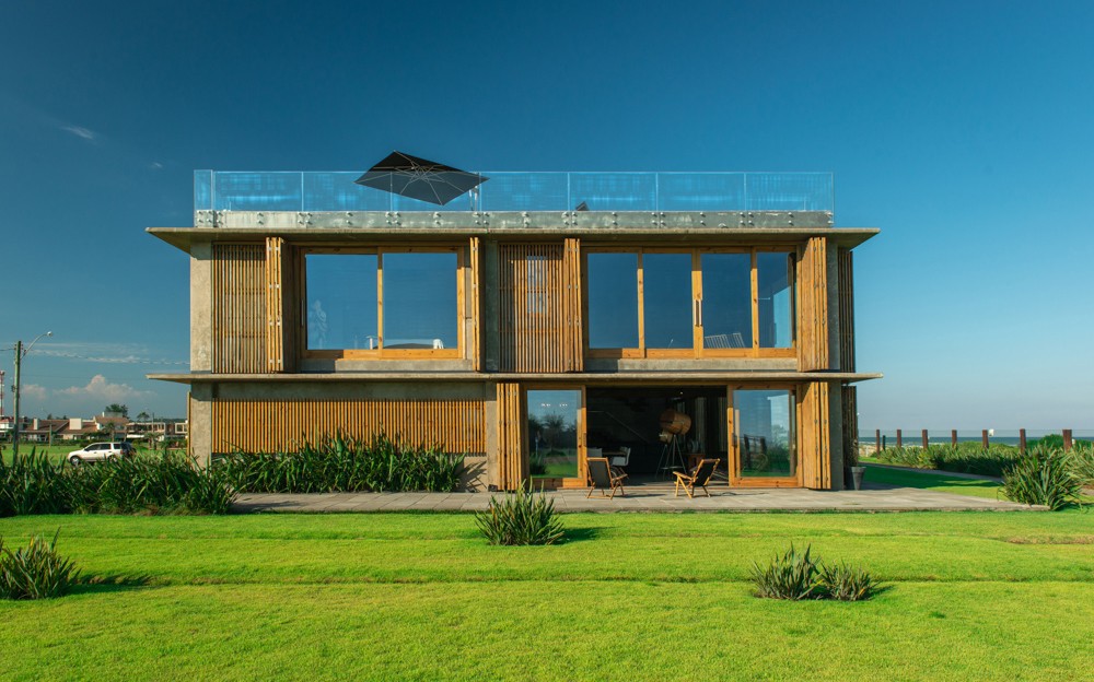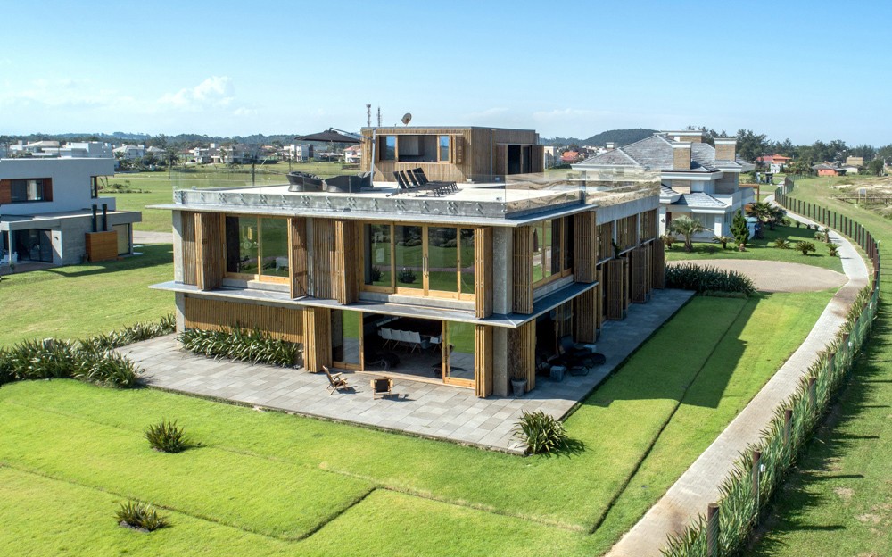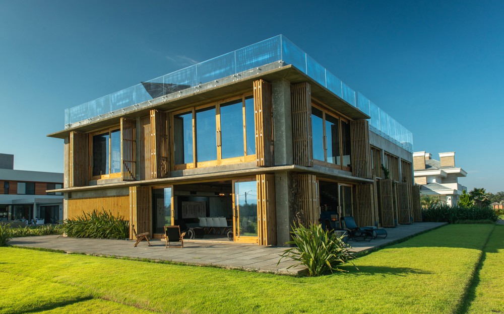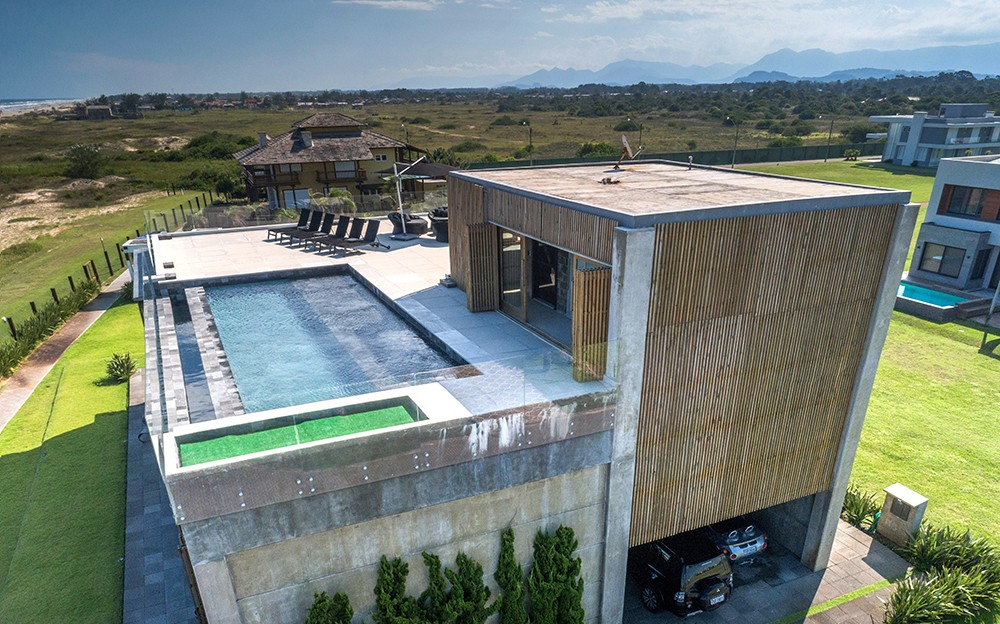Combinar diversos materiais como concreto, vidro e madeira para uma casa elegante e acima de tudo resistente. Inúmeras soluções como ligações semi-rígidas e lajes (placas) alveolares. Com terraço panorâmico e piscina de borda infinita.